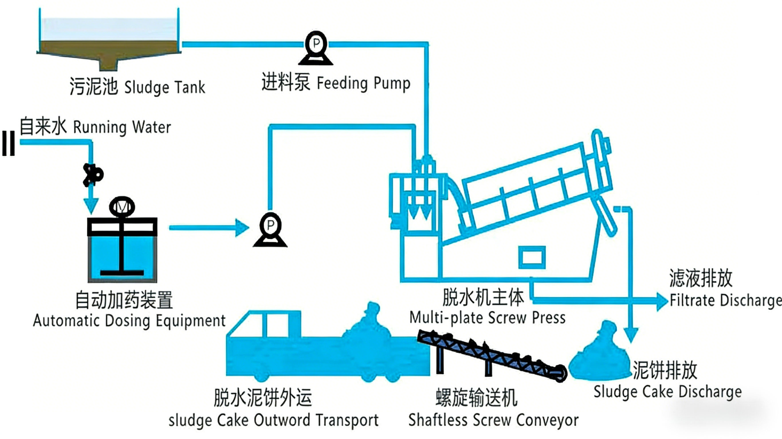 叠螺式污泥脱水机集全自动控制柜、絮凝调质槽、污泥浓缩脱水本体及集液槽于一体,可在全自动运行的条件下,实现高效絮凝,并连续完成污泥浓缩和压榨脱水工作,将收集的滤液回流或排放工作。