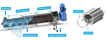 •    浓缩:当螺旋推动轴转动时,设在推动轴外围的多重固活叠片相对移动,在重力作用下,水从相对移动的叠片间隙中滤出,实现快速浓缩。